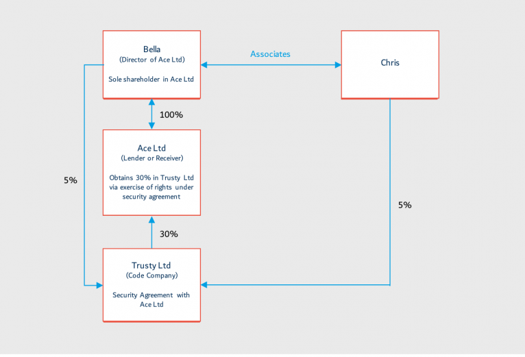 - Ace Limited is a lender which has lent money to Trusty Limited, a Code company, under a security agreement. Bella is the sole director and shareholder in Ace. Chris is an associate of Bella for the purposes of the Code. Ace exercises its rights under the security agreement and thereby increases its control of Trusty to 30% of the voting rights in Trusty. Bella and Chris each directly hold and control 5% of the voting rights in Trusty.